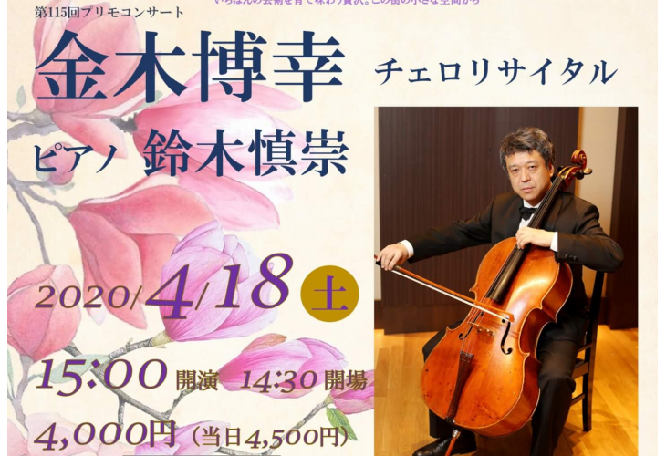 4月182020 PrimoConcert 金木博幸チェロリサイタル 第115回プリモコンサート 東京フィル首席・金木博幸さんと、ピアニスト鈴木慎崇さん。二人の名手によるコンサートも3回目。注目はラロ...