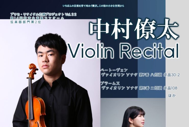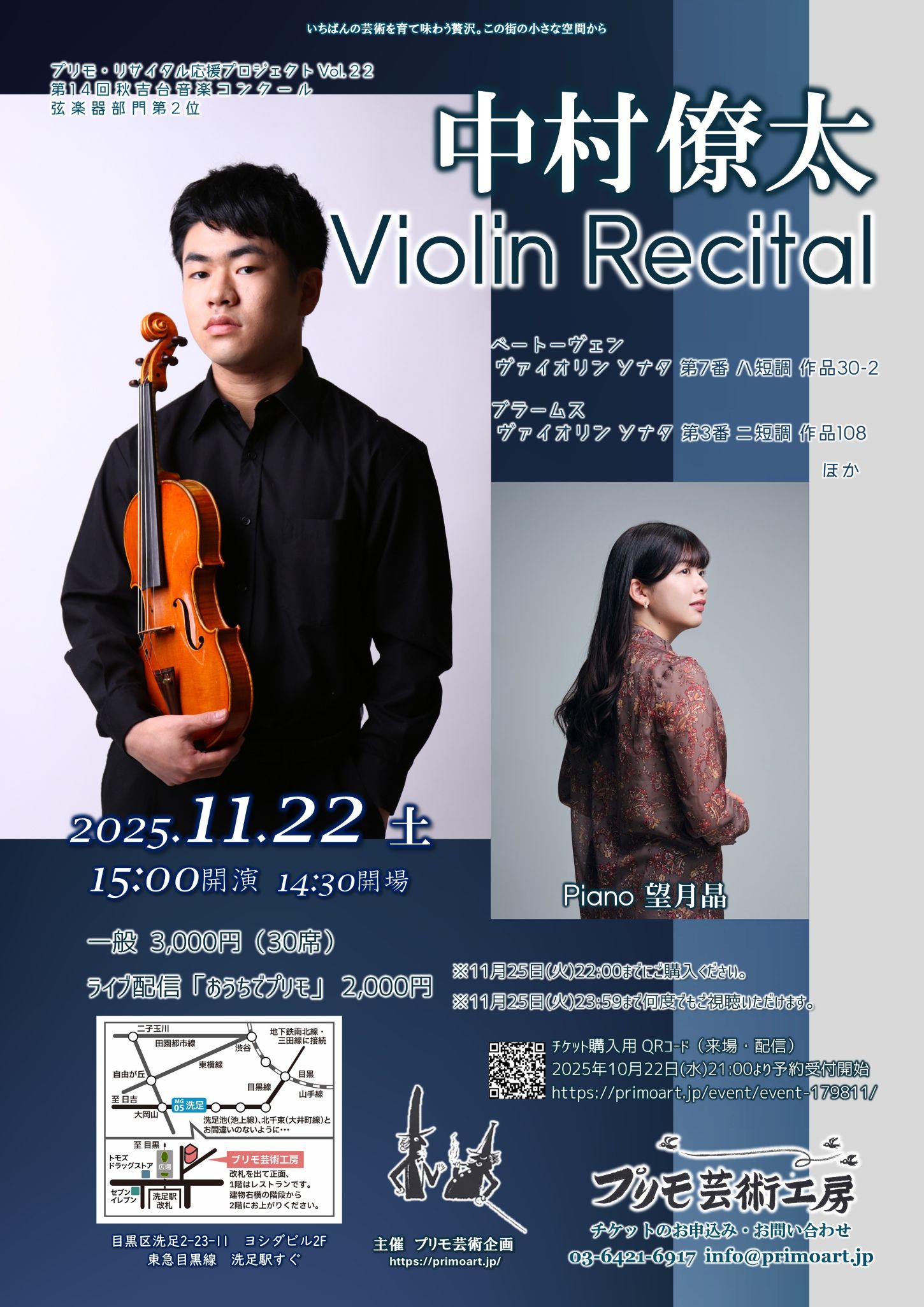11月222025 その他主催 主催公演 配信あり 中村僚太ヴァイオリンリサイタル プリモリサイタル応援プロジェクトVol.22。秋吉台音楽コンクールで注目を集めた若手ヴァイオリニスト・中村僚太さんの輝きの音色で心...