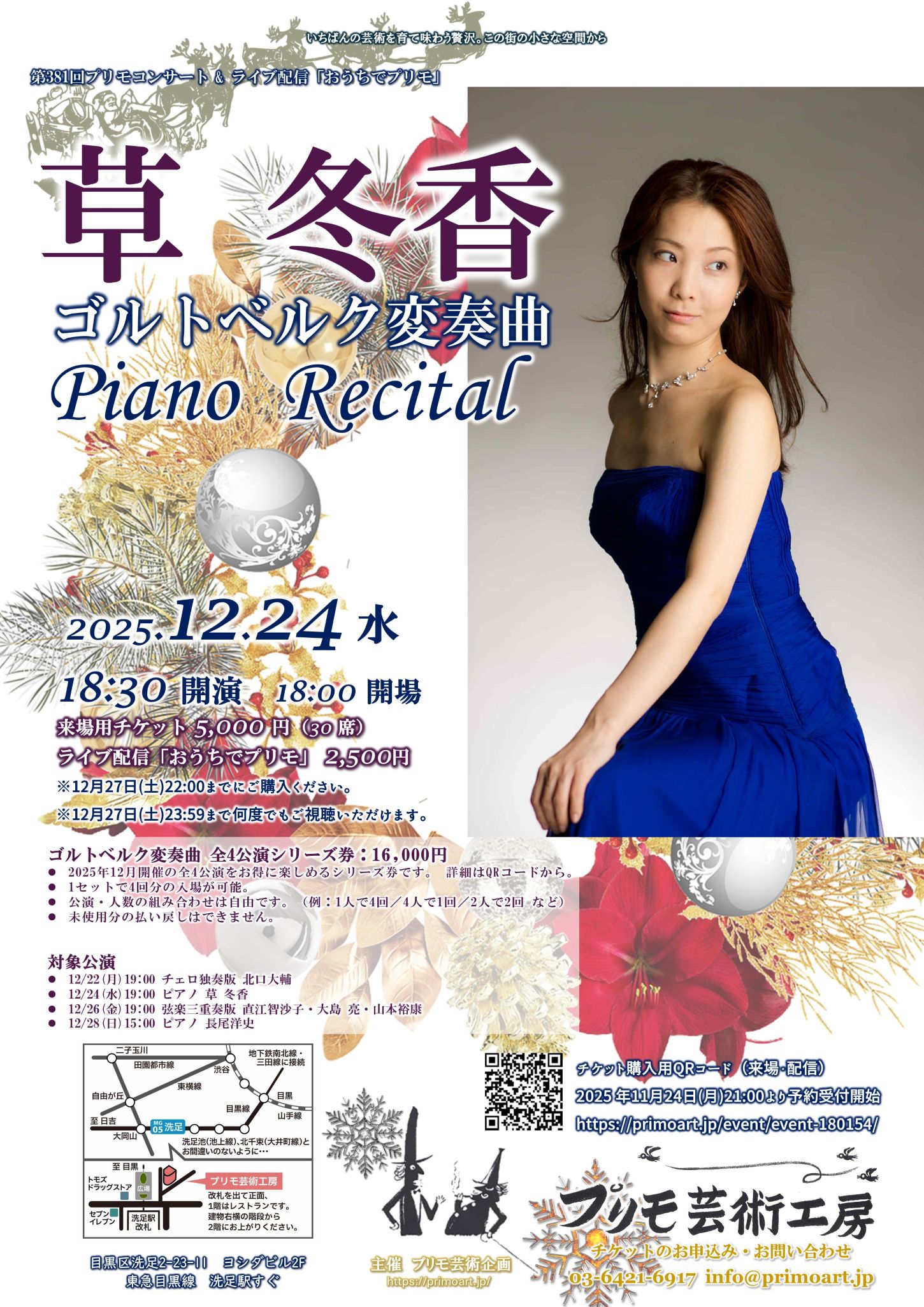 プリモ芸術工房の12月恒例「ゴルトベルク変奏曲」シリーズ第2弾。草冬香さんのピアノが、クリスマスイブの夜に厳かな光をともします。